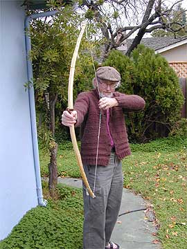 This was just one experiment. Other materials could be used instead of nylon. Dacron, hemp, silk and linen would all work. The amount of nylon and the tension I used was probably correct for this particular piece of wood since the bow is starting to show crisaling on the belly, evidence that the limbs can't stand any more compressive force. Since the effectiveness of a given cordage backing depends on its distance from the neutral plane it would be interesting to put little spacers on the back to keep the cord as far away as possible. The idea of spacing the cord as far away as possible was carried to the ultimate in a bow I saw during the mid 60's at some of the field archery tournaments in central California. It consisted of a rigid handle section very similar to what one saw on fiber glass recurved bows of the day, two limbs hinged to the handle extremities and a loop of gum rubber tubing connected between the two limbs. Drawing the bow stretched the gum rubber tubing. As I remember the bow shot fairly well. It was around for a couple of years and then disappeared. My guess is that the gum rubber would be rather fragile and need to be replaced frequently.