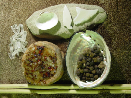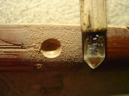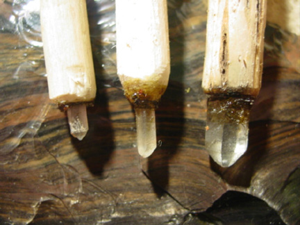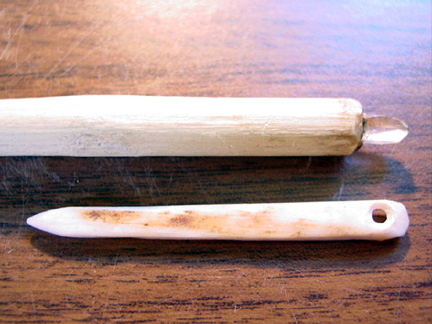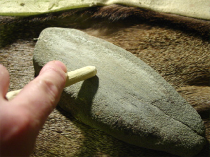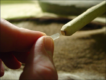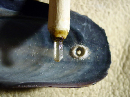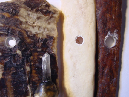 Now it was time to test the tools at hand. The last photos illustrate the various materials that have been successfully drilled with the quartz crystal hand drill. An avid friction-fire practitioner, I am very pleased to have a wholly primitive tool capable of easily starting the socket in which a hand drill or bow drill spindle would spin.