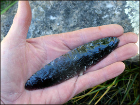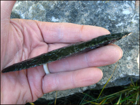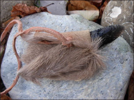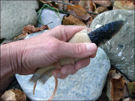I made the little blade from obsidian gathered at Davis Creek, California. It is pretty sharp, so I wanted the sheath to protect hands as well as the blade.