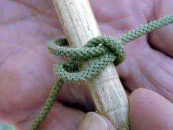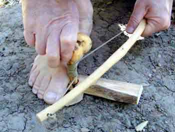 Many novices are plagued by two problems when they try to start a fire with a bow drill. First, the cord isn't wrapped tightly enough around the spindle so the cord slips, the spindle stops spinning, increased rubbing weakens the cord away and I loose my patience and start yelling at the student. Bad pedagogy. Adding injury to insult, the spindle then slides out of the socket and propelled by the increasing tension in the string, flies through the air and pokes someone in the eye. Whoooaaa!