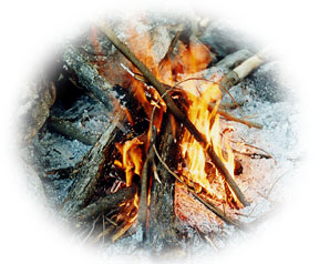 The basic technique for making fire by friction involves spinning a drill against the bottom of a hole in a hearth board. Friction from rubbing the sticks together produces heat and (if the correct woods are used) fine powdery sawdust, or char. The char is collected in a notch cut into the center of the hole. This concentrates the heat, the wood acting as an insulator. If the char is heated to 800 degrees Fahrenheit it will begin to smolder (data courtesy of Richard Baugh). Placing the smoldering char (ember) into a bed of tinder (fine, dry plant fibers) and blowing gently will cause the tinder to burst into flames. This is much easier to describe than to accomplish. Reaching 800 degrees Fahrenheit requires considerable pressure be applied to the drill.