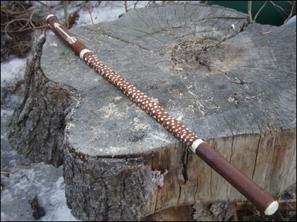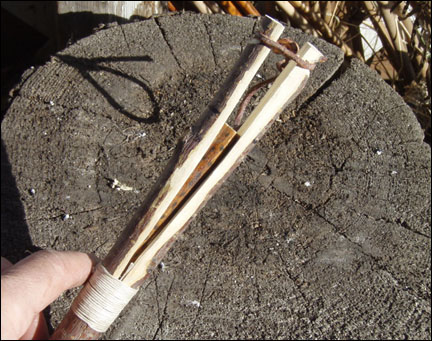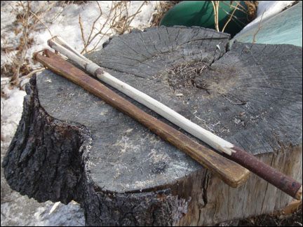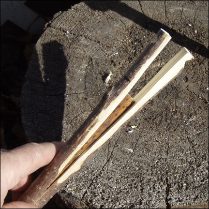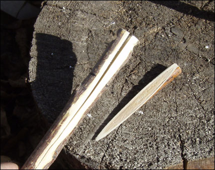 You can't always find a proper forked stick for a fork and cord atlatl. I got this idea from a fellow Alaskan, Steve Werks of Thorne Bay, Prince of Whales Island, Alaska. Just split a straight stick and put a wedge into the split. Be careful not to open the split too wide. The gap acts like the groove on a regular board type atlatl.