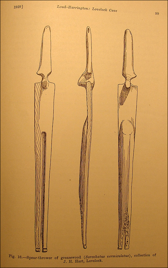 An archeology student sent me a picture of a drawing done by M. R. Harrington. The drawing is an atlatl that was found in the Lovelock Cave of Nevada during the early 1900s. The atlatl was 17 inches long. It was finely crafted from grease wood. On the distal end, where you usually find a hook, was what looks like an identical twin to my fork and cord atlatl. The original artifact was lost, but a copy was made and given to the Phoebe A. Hearst Museum of Anthropology at the University of California in Berkeley.
