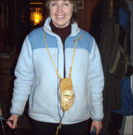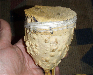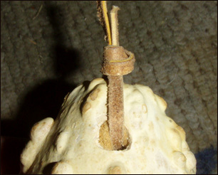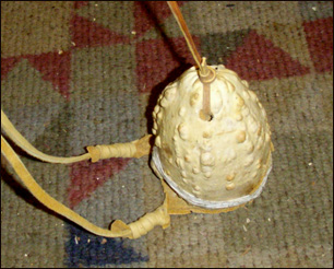 Gourds are a bit fragile, so I poked a hole through each side of the gourd end and slipped a looped cord through with a folded piece of soft leather inside under the loop. This distributes the stress from the looped cord.