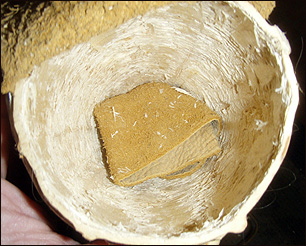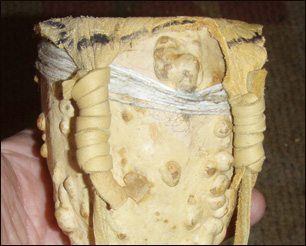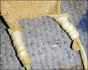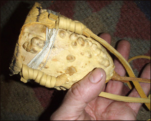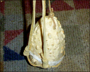 I tied the flap on the gourd with waxed linen twine. The pebbles will fall out of the leather flap.