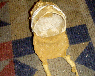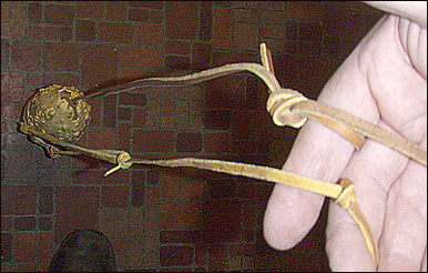 Then tie another loop, at the right length, to the end of the looped cord that is attached to the end of the gourd. You can load these slings with a handful of pebbles or one large rock.