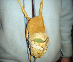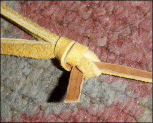 Use a whipping knot to connect the two leather attachment points with a leather cord. Find the center of the leather cord and tie a sheet bend with another piece of leather cord. This cord will have the release knot. The leather cord connected to the two attachment points let you hang the gourd around your neck loaded with pebbles.