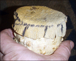 The flap is soft leather with two attachment points. The width of the flap hinge is about a third of the circumference of the gourd. Don't make it too big or too small.