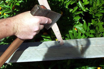 Nocks can be cut into the bow by making light chopping cuts and then using the hatchet blade as a knife to cut the notches. To make the cuts required for the nock, I generally grasp the head of the hatchet and force it downwards into the wood while it is sitting on a firm surface. The hatchet can be rocked a little in a side-to-side motion as the cut is made. A single notch at each end of the bow (on opposite sides) can work well enough. A single notch nock is shown in the photograph near the top of this article, but there are several different types of nock which could be used.