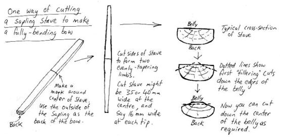 Below is a diagram which suggests how a bow could be cut from a sapling stave with a hatchet. I recommend that you leave the bark side of the sapling as the back of the bow (the side that faces away from the archer), and that you do not cut or damage the back in any way. The bow shown in the diagram is intended to be one that bends fully along its length... it does not have a stiff handle section.