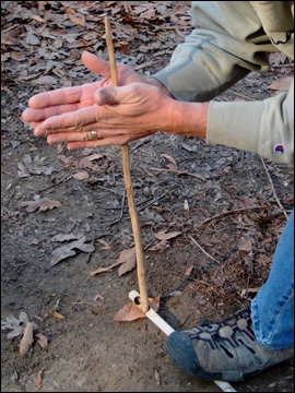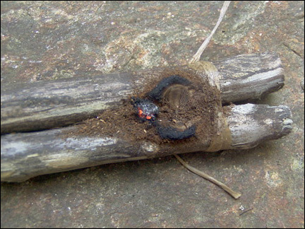 If you cannot find suitable wood large enough for a pit based hearthboard, you can join two smaller sticks together with cordage or sinew. cutting a perpendicular groove will help hold the spindle in place, or sometimes you can just rest it next to the binding material and it will tend to keep it in place while the spindle turns. The space between the sticks creates a trough and acts as a notch. This method allows smaller wood stock to be used.