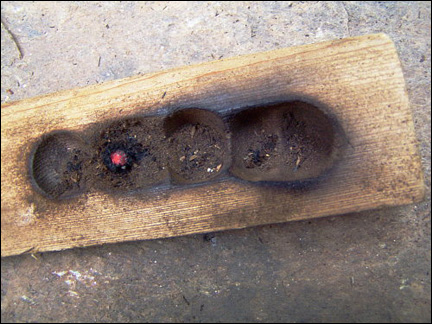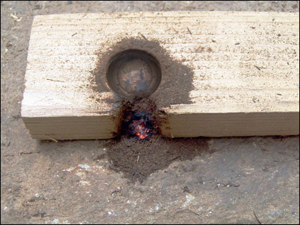 The trough can be fashioned by cutting a deep grove in a board, or, it may be found naturally by virtue of a linear crack in a branch or log, or, some woods have linear lobed spines that naturally create a trough. A perpendicular cut can be used as a pit to stabilize the spindle head. As the char forms, the trough acts as a notch. This method can be used with larger pieces of wood stock.