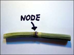 The next step is to cut the horsetail into suitable lengths to produce whistles of different pitches. I find that using a swift chopping motion with an antler cleaver works well, giving a clean cut without crushing the horsetail. When cutting horsetail into whistles, you don't want pieces that are totally hollow. One must leave an intact node, or cross-wall, inside the length of each piece. Some species of Equisetum branch at these nodes. I have not had success making whistles out of these species. Experiment, experiment, experiment! Knowing nothing about music, I cut a couple hundred pieces and blew away, setting aside those that "sounded right." Generally, the longer and/or wider the piece, the lower it will sound. Coincidentally (I whimsically prefer instinctively), when I finished selecting those whistles I deemed good enough to affix to a frame, a musician friend informed me that my arrangement decently coincided with a nearly two octave scale, starting with a C (438 Hz).