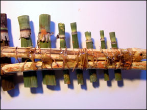 This horsetail pan flute is easy to make, but takes patience and dexterity, especially when securing each piece of horsetail to the frame. I initially made the mistake of using fresh horsetail when assembling my first pan flute. This resulted in whistles that shrank away from the frame and the yucca bindings, as well as buckled into unattractive, tone-less hanks of horsetail. It seems very important to thoroughly and slowly dry whole horsetail stems in a cool place devoid of direct sunlight. For the material in my locale, this process took three weeks.
