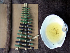 For the triangular frame, I chose clematis, which was light and handy. Here was the most difficult part of this endeavor - attaching the horsetail to the frame, which proved to be intricate and taxing to my dexterous capabilities. In the photos you can see the grand fir pitch and yucca fibers I used to attach the whistles to the frame. After I tied the frame together with yucca, I glued each whistle to the frame using the heated pitch. Upon drying, I then tied the horsetail to the frame with a yucca fiber, with the thicker fibers being more reliable (but be careful not to crush the horsetail when cinching down your knots!). Occasionally a whistle would dislodge from the frame with handling, so re-application of pitch was necessary. When each whistle was finally tied to the frame, I re-enforced the bindings with a drop of heated pitch. On the finished product, I rubbed ochre rock dust on all pitched surfaces to eliminate stickiness.