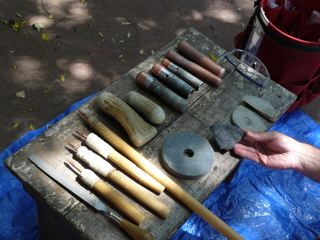 NOTE: Knapping can cause serious harm to your body. Wear gloves and eye protection. Protect your legs and feet by keeping them covered. Always wear protective gear while knapping.