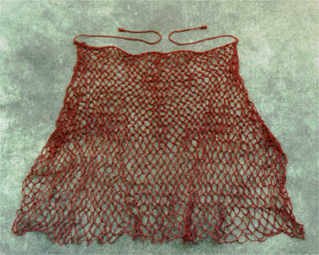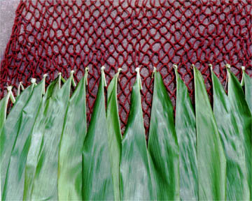 To construct a ti leaf rain cape, a fine netting was first woven. A cord was passed through the neck marginal meshes, knotted to the meshes at each end, and the cord ends left free for tying. The traditional netting for the cape in Old Hawai'i was made of olona (Touchardia latifolia) or hau (Hibiscus tiliaceus) cordage.