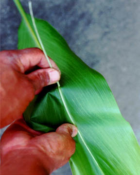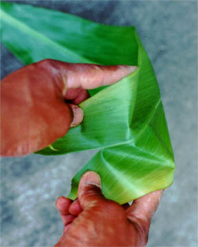 The midrib, or bone, from the center of the leaf was removed from each leaf. The ti leaves were then split in two halves.