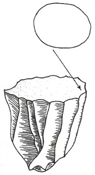 Good stone breaks like glass: a direct perpendicular hit to a flat surface creates a cone of force spreading out in obtuse angles from the line of force, causing a small conical pyramid to break away, as when a bullet strikes a window. All flint knappers, ancient and modern, know instinctively from endless trial and error how fine stone breaks. The basic theory holds true for direct percussion (stone against stone), indirect (bone or another object held against stone and then struck) and pressure flaking. In order to take a thin and useful flake from a projecting surface, or platform, the blunt tip of a section of antler must be held against its edge at an angle tilting away from the vertical cliff wall beneath (which hopefully will break away and become the flake). The antler tine tilts so an edge of its imagined cone of force passes just under the vertical face of the cliff below. The antler punch is also positioned in line with a ridge on the cliff wall to make a long flake. A rounded stone about the size of a fist strikes the antler smartly. A tentative weak hit will only crumble the rock or cause a step fracture (terminating the flake too soon with a right angle break) and will not produce a long sheer flake. Too hard and the rock shatters. Step fractures can also result from too straight an angle of force, not following ridges (on the cliff wall) or improper preparation of the striking platform (it may need grinding with sandstone). Hinge fractures, a blade with a premature rounded blunt break, occur when the platform forms an angle greater than 90 degrees with its cliff wall.