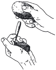 The Chumash, recorded Henry Henshaw in the last century, placed the flint in the cleft of a large stone to steady it while a very hard obtusely pointed pebble of agate was held against it and struck a quick tap with a quartz rock. In this way they made knives and arrowheads.