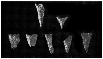 California arrowheads. Top row: from foothills of southern Cascades near Oroville (including Yahi territory), before A.D. 1000. Point on left is desert side-notched style. Bottom row: arrow points from coastal southern California and offshore islands, from A.D. 500 until European contact (All of these and many other stone artifacts are found in Joseph and Kerry Chartkoff's "the Archaeology of California, 1984.)