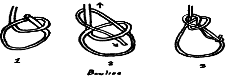 Bowline: This is a loop that won't slip, or come loose. It can be untied even under tension. It is used to attach a line to an object, such as a peg, or ring, or a person (rescue work). This is the knot remembered with "a rabbit comes out of the hole, goes around the tree, and back in the hole". It should not be used with a stiff line.