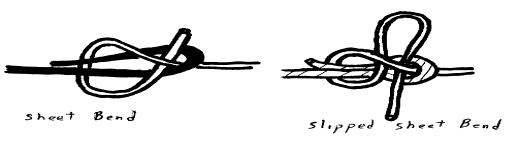 Sheet Bend: This is used to tie two lines together, to extend a line, or to tie a line to fabric. It is particularly useful for tying two lines of different diameters. A variation is the slipped sheet bend for ease of untying. Try this mnemonic "the rabbit comes out of the hole, around the tree, and under the exposed tree root".