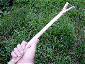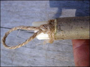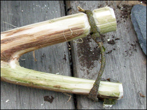 Using just a forked stick and some twisted bark tied across the fork is another way to make an atlatl with minimal cordage and tools. This one was made with a sharp stone flake. Even with this crude looking atlatl, you could propel a good stone tipped dart through both sides of a 1,500 lb. moose at 20 yards.