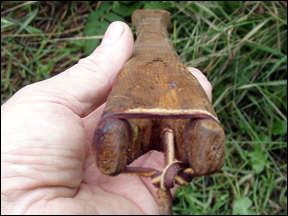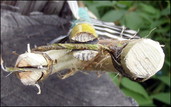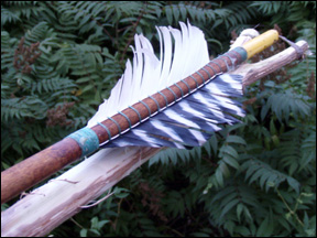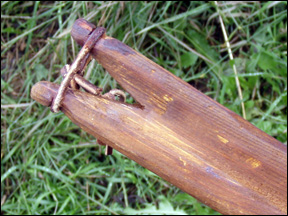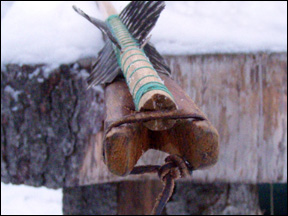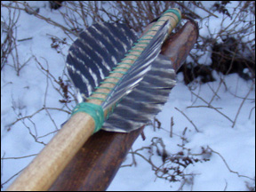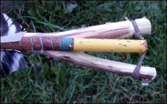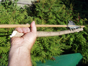 The fork 'n' cord atlatl is something I came up with to equal the fast reloading of the my best hook atlatl. The grooved board guides the end of the dart like in many of the Eskimo and Aleut designs. Instead of coming up to a hook, I put a cord across a fork in the end of the throwing board. With cross nocks and four fletches, I can load darts blind folded. On my three fletch darts, I put a cock feather or fluffs on the dart, so I can orient nock for reloading.