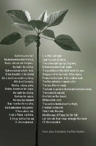 Other uses for olona in ancient Hawaii were as threads for stitching together kapa, tapa bark cloth, into garments, for stringing and wrapping all manner of lei, to tie off the umbilical cord after a birth, for canoe lines, stretching drum skins over drums, and for every possible purpose that we today might use rope, twine, string or thread.