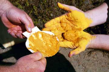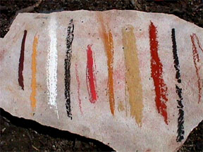 Listed below are the most commonly used colors in rock paintings around the world. Other colors like blues and greens were used, but very rarely. Blues and greens could be composed of toxic materials. We will focus on those colors that are easily found and processed and that are safe to use. There are always exceptions. Learn what your local materials are made of, and be careful. An extensive list of dangerous materials can be found in Bulletin of Primitive Technology #15 "The Dirt On Colors".
