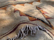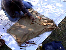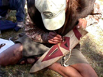Now that you have usable, storable pigment, you need a binder to apply it to whatever surface you want to decorate. The simplest binder is water. In fact, when it comes to cave painting, tests have shown that cave water is the best thing to use. What if you don't want to do a cave painting? The questions you have to ask yourself are: What is the material that you are applying the pigment onto? How long do you want it to last? Will it need to be water proof or at least water resistant? Answers to all these questions determine the binder that will be used. The basic rule of thumb for applying pigments onto any surface is: The binder should be as similar a material you can find as the material you are applying it to. Plant based oils, juices and saps on woods and plant fibers, animal based oils, fats, egg yolks, eye and hide glues on hides, skins and bones. Experience using hide glue and milkweed sap as a binder, have shown them to be water resistant on a variety of surfaces. Binders are as varied as the cultures that used them. Local materials would have been known and used. A good example is the binder used by the Chumash Indians of Southern California, to produce their wonderful polychrome cave paintings. It is believed that they used a combination of milkweed sap and wild cucumber (Marah fabaceus) seed oil as a binder.