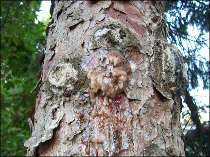 I try to collect pine resin deposits that happen naturally, usually caused by a fracture in a limb by a storm, lightning, or animals scratching on the bark. I also gather resin that oozes naturally out of the broken knots in the pine tree. The runny clear resin, the dried up clumps of amber or the flakey white drips, dried from seasons past, are all good resin for making pine pitch.