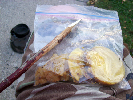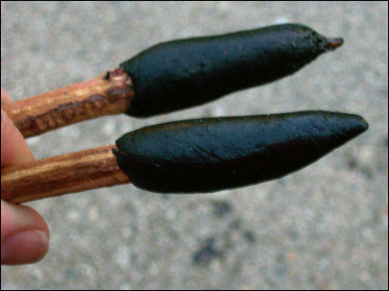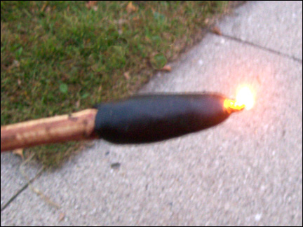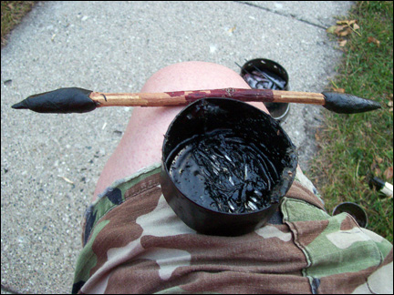 After the resin, wax, and filler are mixed well, take the tuna can away from the heat source. Thoroughly mix the ingrediants until you get it to the consistency of a good, thick tar. You will notice it will start to harden quite fast. Take a small “gob” and and ball it up on the pointy end of a stick. Lick one of your palms a couple of times or moisten your palm with water (this keeps the hot pitch from sticking to your hands. Be sure the pitch is not so hot that it burns your hands!) and knead the ball into an oblong shape as it hardens. I try to make sure it's uniform around the stick and the small pointy end of the sharpened twig sticks out.