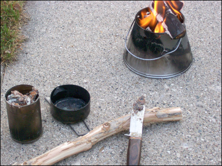 Take the tuna can to the heat source again and SLOWLY stir everything together with a stick. I like to use a hardwood twig about the diameter of a pencil and sharpened at one end. This helps to get in the corner of the tuna can when mixing and becomes a “slow match” when you apply the pitch.