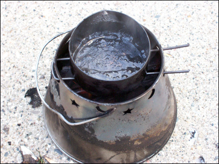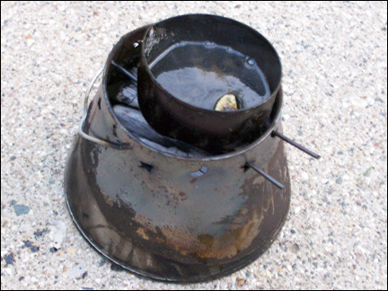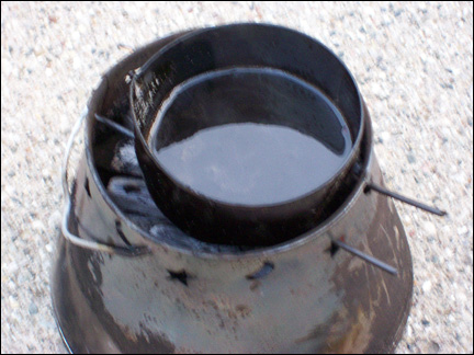 When I get the can, with the pre-punched holes, filled up almost to the top with resin, I take it home. I use a standard tuna can for the melting and semi-straining process. The soup can, with the pre-punched holes that contain the resin globules, will fit inside the tuna can. This acts as a double boiler. Place the tuna can, with the soup can inside, on top of a fire. Pre-heat the resin before you start.