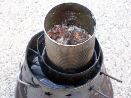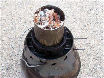 When you have managed to squeeze out all of the resin out of the bundle of bark and other debris, take the set-up off of the heat source and slowly remove the soup can from the tuna can. The cans will be hot to the touch. Use something, like a pair of metal tongs, to lift the cans. Be sure that you do this slowly, as you do not want to waste any of the hot, liquid resin still draining from the soup can.
