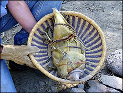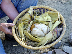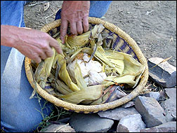 The fire was raked over the top of the pit and rekindled. It was kept burning until 5:30 p.m. when it was allowed to die down to a few coals. The pit was then uncovered carefully, moving earth and thistle from the center to the sides. The corn husk wrapped chicken was intact inside, steaming hot and damp with moisture from the thistles and husks. When the wrapping was removed, there was no sign of dirt, and the chicken was very moist, tender, and quite flavorful.
