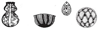 Kamia seed jar at left in Rogers, 1936. To the right of seed jar are Mohave motif: bowl with rain pattern, ladle painted in fish backbone design and stylized cottonwood leaves on bowl from Kroeber; 1925.