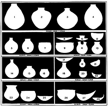 Forms were not random in distribution. Semi-globular food bowls (26), plate-like parching trays (17) and ladles (28) stood out among the agricultural Colorado River Yuman groups while the desert Kamia favored graceful, long-necked water ollas (14). The slender water olla neck was often only an inch in diameter on the inside; they came in many sizes; small ones 19), sometimes with a thong strung from two holes just below the rim, were used as portable canteens. Kamia food storage ollas, on the other hand, were infrequent and not often of great size. In contrast, large storage vessels (1-4) typified the seed gathering mountain groups to the west.