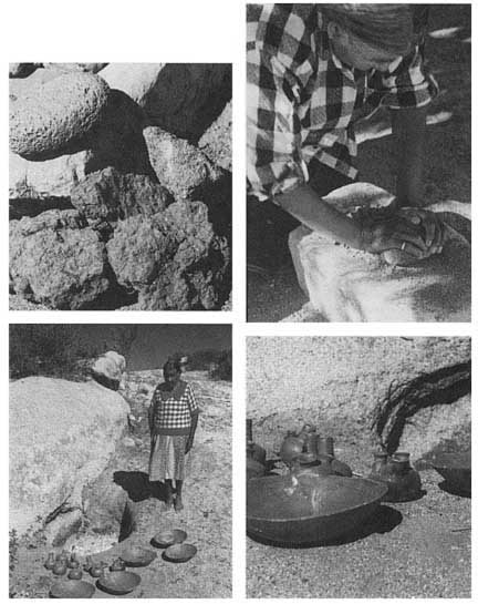 left. Pulverizing with mano on the grinding stone, above right.