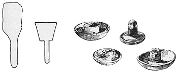 Old-style Southern Diegueño paddle on left, new on right. (Drawn from Rogers, 1936.) Next, two pottery anvils of the Cocopa in the University of California collections. At right, early Southern Diegueño pottery anvils from Campo, California, Museum of the American Indian, Heye Foundation: (First Diegueño anvil, about 9 cm. in diameter.) These are virtually identical with those made by Josefina Ochurte in Santa Catarina in 1994 (drawings in Gifford, 1928).
