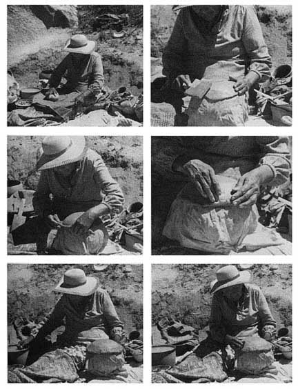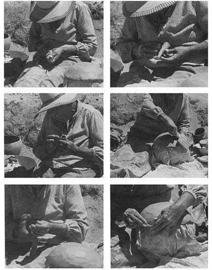 Left to right and down: With large mano Josefina Ochurte flattens ball of clay into tortilla-shaped base for new pot. She paddles it out on cloth-covered bottom of old bowl. A coil is placed and attached with finger tabs. She wets a polished stone and with it smoothes the new coil onto the base.