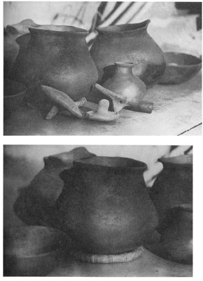 Above, cooking bowls of Paipai Josefina Ochurte, some with tab-like rim handles,flanked by food bowls and small canteen. Pipe and anvils to the .front. Below, the cooking bowl resting on a Kumeyaay ring made of a hoop of split juncus strips wound with more split juncus. Mohave women used similar rings to carry large bowls on their heads.