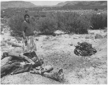 Teresa Castro and trunks of Mohave yucca near pit oven in which pottery has been stacked and covered with yucca trunks, Santa Catarina 1997. Not until she had grown into womanhood did she know of modern pots and pans and glass dishes. Her Kuatl (Southern Diegueño) mother made everything of clay. Castro's Paipai father had taken his family to a remote valley 40 miles from Santa Catarina toward the Pacific Ocean near San Vicente, a valley rich in acorns and other gathering opportunities. Isolated in the valley called Dolores, they lived with only one other Paipai family for her childhood and youth. She recalled the day they discovered a cave full of wooden weapons and tools made by Indians long before. Her father said it was best to leave such things untouched and they did.