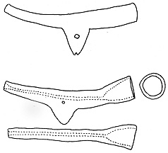 Above, old Southern Diegueño pipe (drawn from Rogers, 1936). Below, three views of a Paipai pipe (nearly 5-3/4" long), Santa Catarina, 1994.