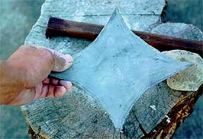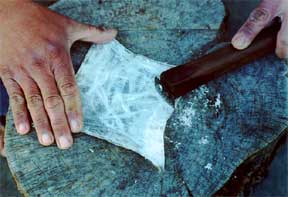 After the skin has totally dried, you will need to thin out the skin. With some kind of scraping implement (I used my hide scraper), scrape the underside of the shark skin. If you don't have a hide scraper, use your knife (not the butter knife, but a sharp knife) at a 90 degree angle. Be careful not to cut into the skin.