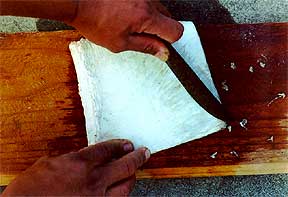 To begin the process of turning your shark skin into rawhide, start by separating the skin from the meat with a knife. Be careful not to cut into the skin. You'll find bits of meat and stringy membrane still attached to the underside of the skin. With a butter knife, placed at 90 degrees to the underside of the skin, scrape off as much of the remaining meat and membrane as possible.