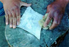 NOTE: The process above will only take the shark skin to the stiff rawhide stage. The denticles are still attached to the skin. This is not a method to tan the shark skin into supple leather.