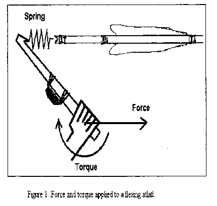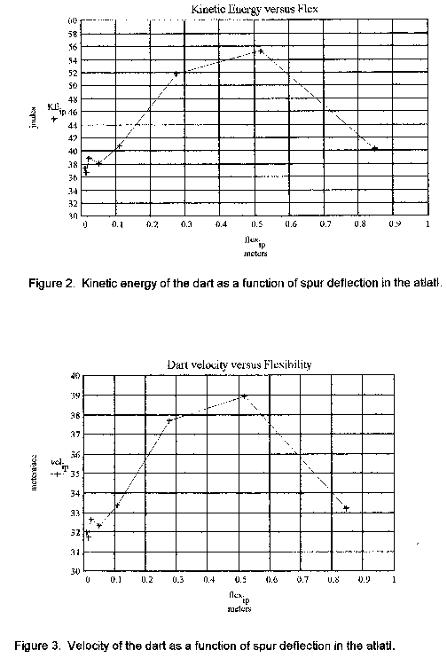 Extravagant claims have been made regarding the increased dart velocity achieved with a flexible atlatl. This report quantifies the increase in projectile velocity or kinetic energy caused by allowing the atlatl to flex. It is a summary of detailed mathematical analysis on flexing atlatls. The model for the human effort involved in throwing the dart with an atlatl was derived from experimental data cited in "Atlatl Dynamics" by Richard Baugh, published in Lithic Technology, Spring, 1998. The human effort (force and torque versus hand position) involved in throwing is assumed to be constant. It does not depend on the masses or dimensions of the atlatl and projectile. The model for the flexing atlatl, shown in Figure 1, consists of a rigid atlatl coupled to the dart via a lossless spring. The dart mass and atlatl length and mass are similar to those of BPS equipment. The dart velocity was computed for various values of spring stiffness. A perfectly rigid atlatl would be represented by very large spring stiffness. It is convenient to characterize the atlatl stiffness by the distance that the tip deflects during the act of throwing. Remember, the human effort remains the same so increased flexing is due to increased compliance (flexibility) in the atlatl. The results are summarized in Figures 2 and 3. These plots shows the kinetic energy and velocity of the projectile as function of the amount that the spur deflects. In order to achieve an 11 % increase in kinetic energy the tip of the atlatl would have to deflect approximately 0.1 meters. These results are for a specific thrower, atlatl and projectile. It is difficult to generalize the results however one can say that the increase in projectile kinetic energy can be no more than the potential energy stored in the flexing of the atlatl,